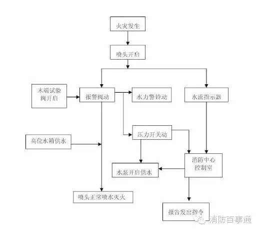 當(dāng)自動(dòng)噴淋滅火系統(tǒng)的保護(hù)區(qū)域內(nèi)發(fā)生火情時(shí),火場環(huán)境溫度升高,閉式噴頭上的玻璃球破裂(或易熔合金熔化),噴頭打開噴水滅火。此時(shí)由于濕式報(bào)警閥出口側(cè)管網(wǎng)水壓下降,形成壓差,閥瓣組件打開,供水側(cè)水源水不斷補(bǔ)充管網(wǎng)滅火,同時(shí)水流也經(jīng)密封環(huán)槽內(nèi)的孔流入延遲器,并迅速充滿,以一定水壓沖擊水力警鈴發(fā)出連續(xù)的報(bào)警聲,壓力開關(guān)動(dòng)作接通電觸點(diǎn),并將信號(hào)反饋至控制中心,以聲、光報(bào)警,同時(shí)啟動(dòng)主供水泵進(jìn)行消防滅火。