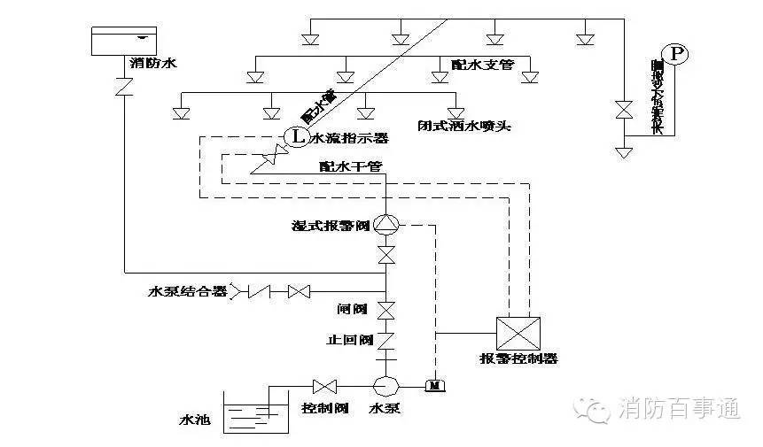 由噴頭、管道系統(tǒng)、濕式報(bào)警閥、報(bào)警裝置和供水設(shè)施等組成。由于該系統(tǒng)在報(bào)警閥的前后管道內(nèi)始終充滿著壓力水,故稱濕式噴水滅火系統(tǒng)或濕管系統(tǒng)。